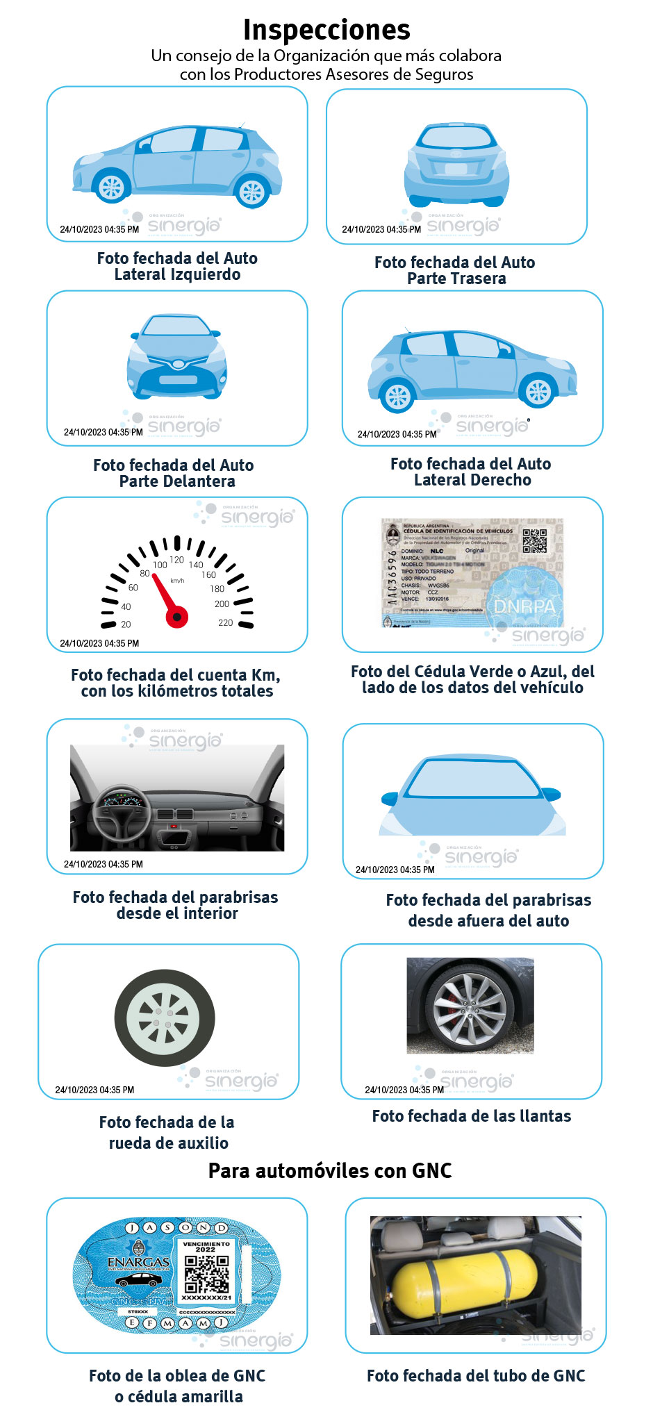 • Fotos fechadas (Frente, Trasera, Lateral derecho, Lateral Izquierdo, Parabrisas desde adentro del vehículo, Rueda, Rueda de Auxilió, Equipo GNC de tener) en forma manual ( anotando la fecha en una hoja y mostrando cada parte del auto) o a través de aplicaciones en el celular ej: Open Camara / Timestamp Camera / Auto Stamper